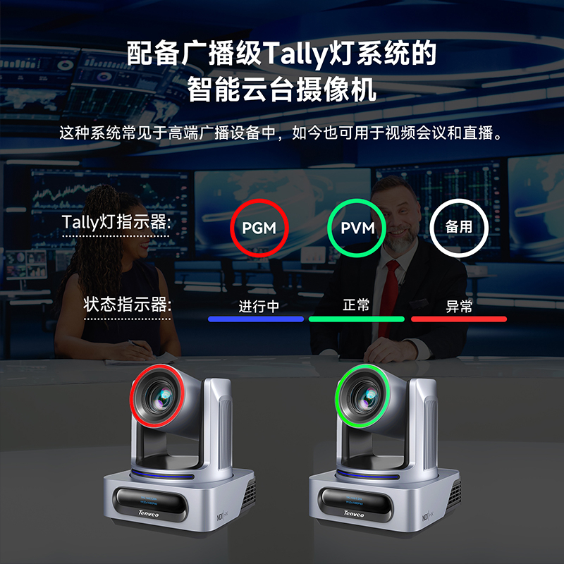 机身前后设计多个Tally交互指示灯以及IP显示屏,可实时显示摄像机IP地址以及视频分辨率,可多方位灵活查看摄像机工作状态。