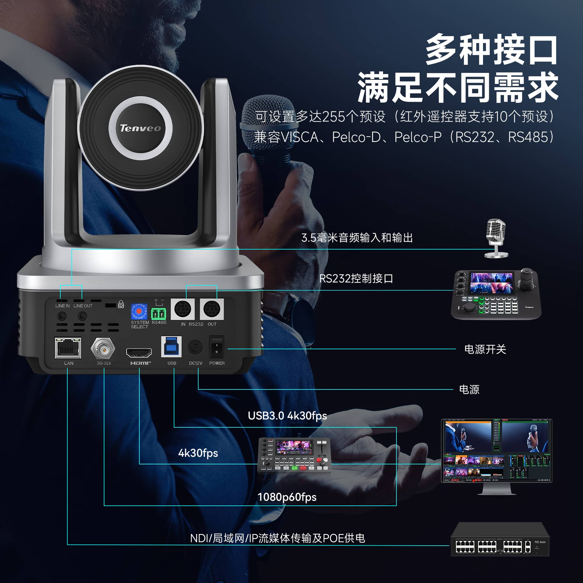 HDMI、SDI、RJ45、USB3.0 音频输入 输出等接口设计,满足会议场景的多样需求。