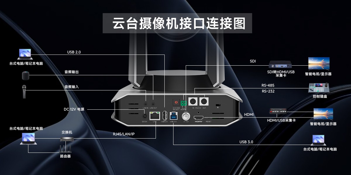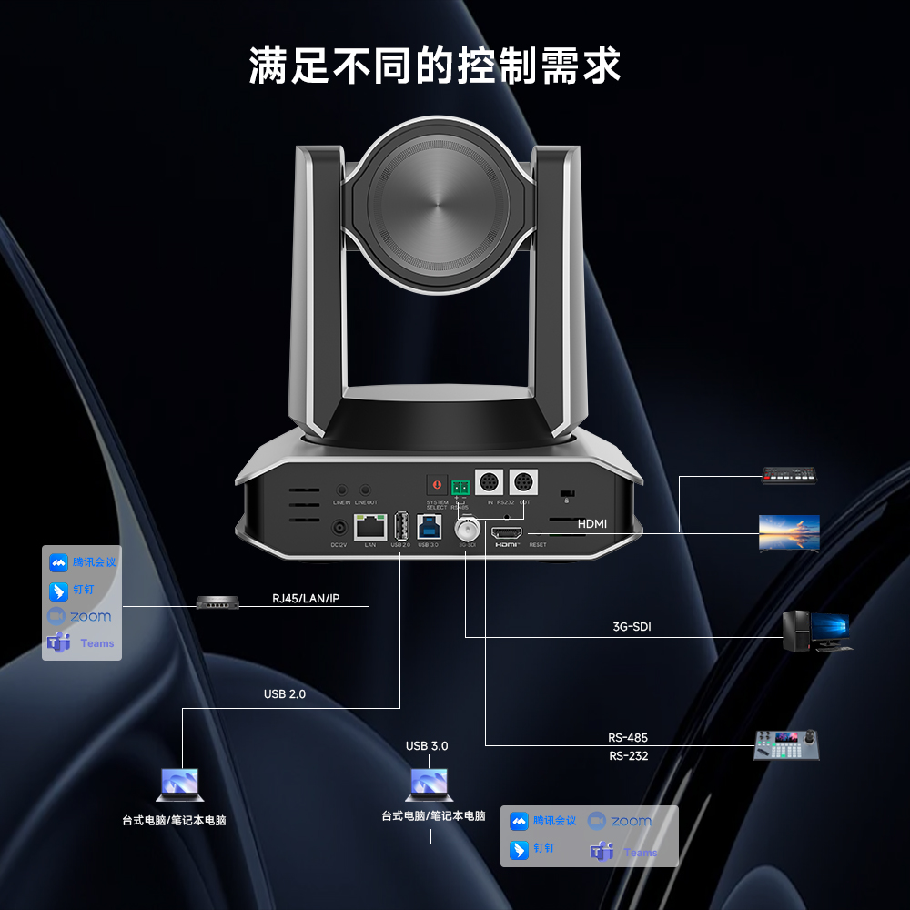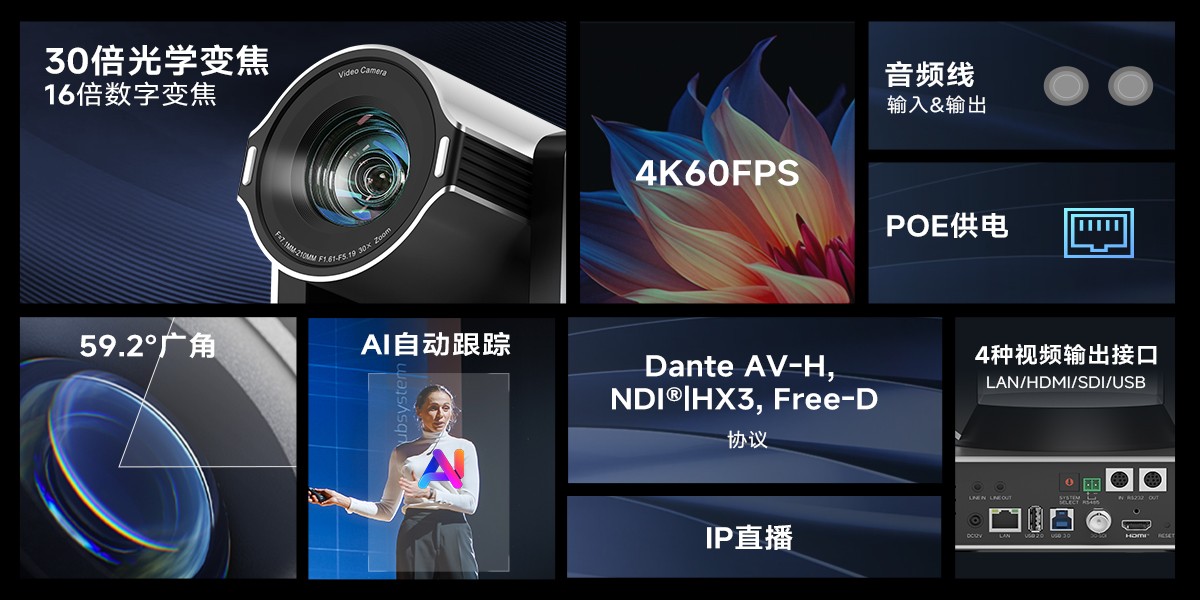 接口丰富,拥有USB3.0、HDMI和网口,支持POE供电,一根网线即可解决供电和视频传输问题。支持NDI|HX协议,方便进行专业直播和多机位切换。同时兼容VISCA、Pelco-P/D等控制协议