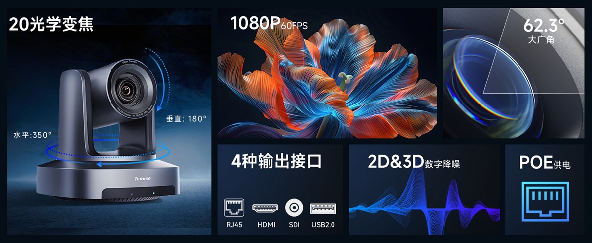 HDMI、SDI、RJ45、USB3.0等接口设计,满足会议场景的多样需求。